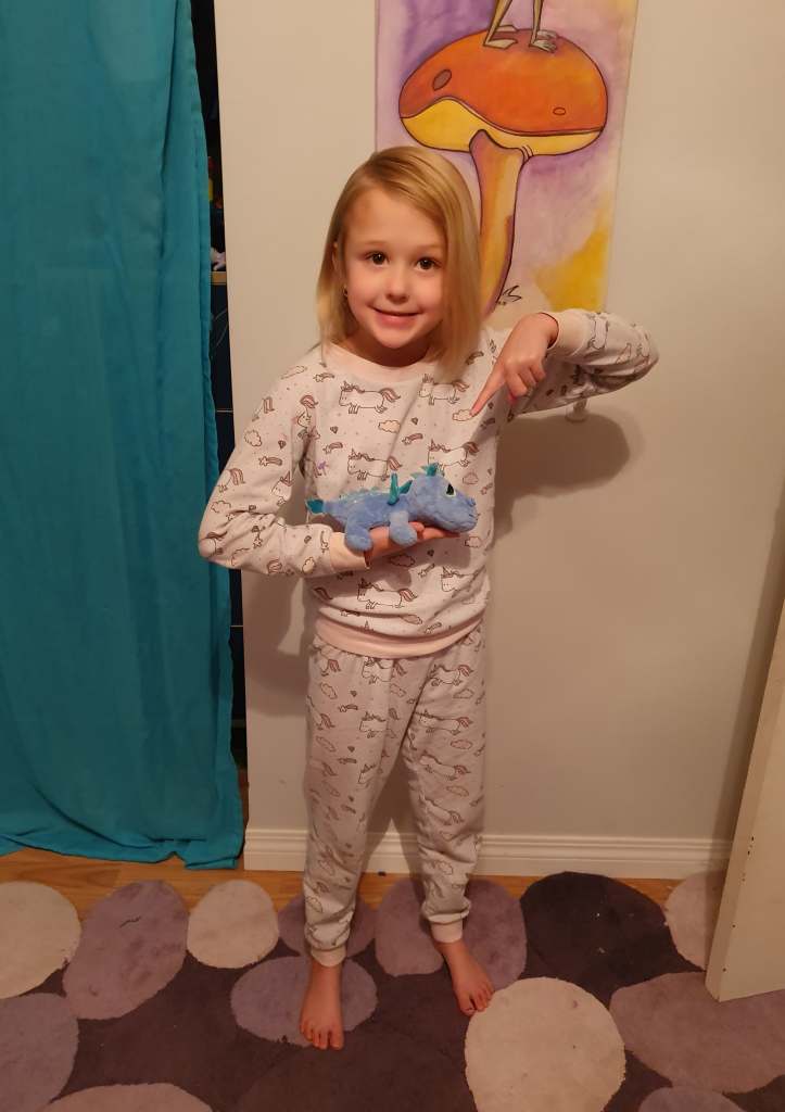 Each year we get a picture of her with her blue dragon. At birth, it was the same size, she was!